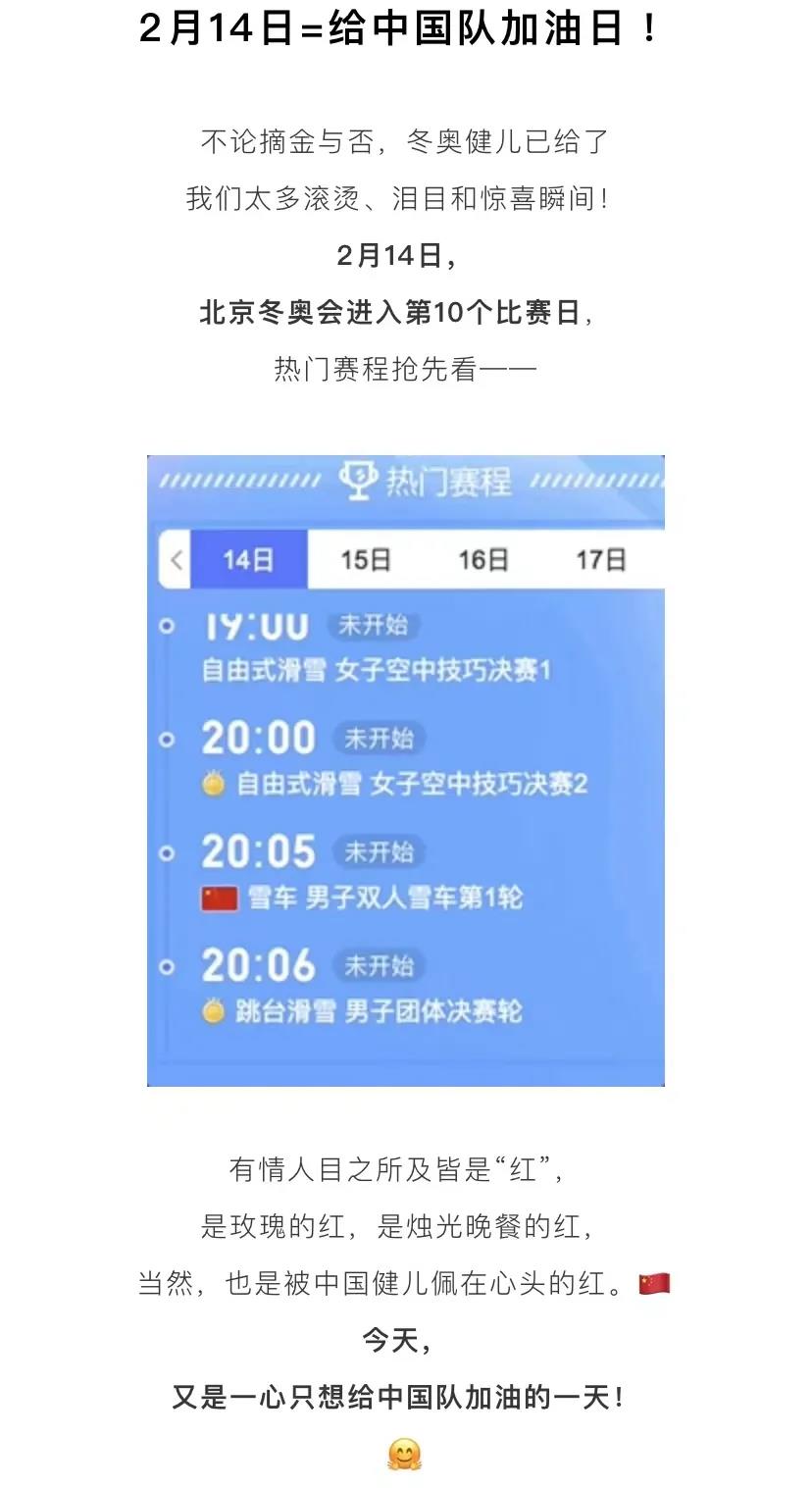 今天(2月14日),2022北京冬奥会进入第十个比赛日。中国选手王诗玥、柳鑫宇将出战花样滑冰冰舞自由舞金牌赛,谷爱凌、苏翊鸣将再度亮相分别出战自由式滑雪女子坡面障碍技巧资格赛和单板滑雪男子大跳台资格赛……